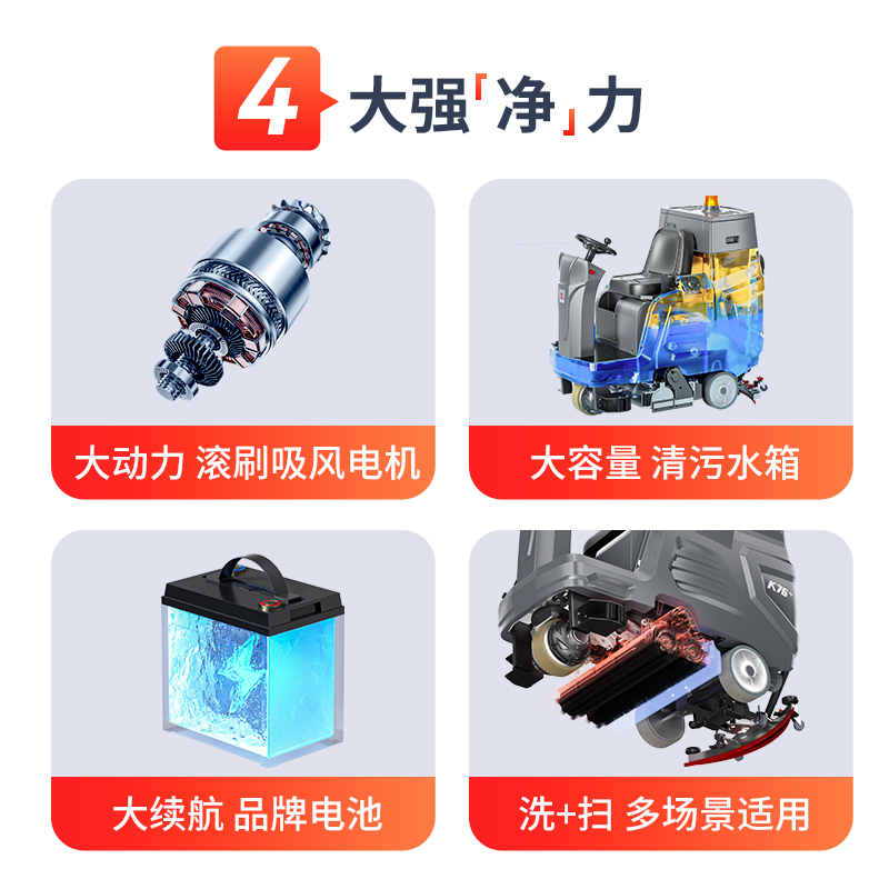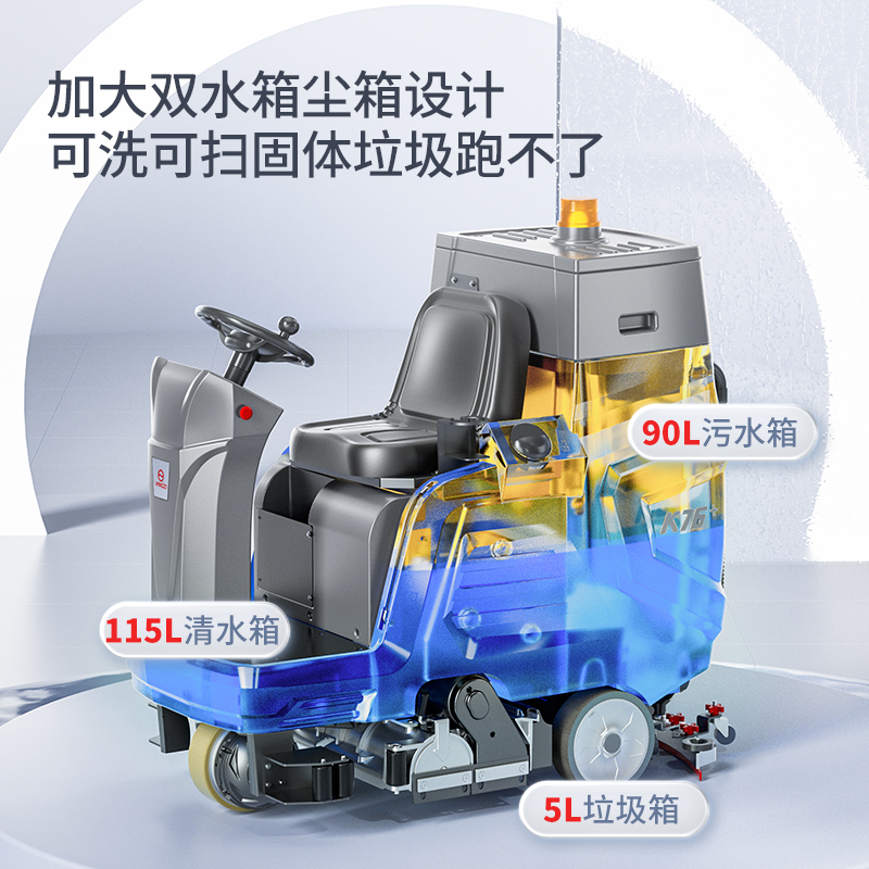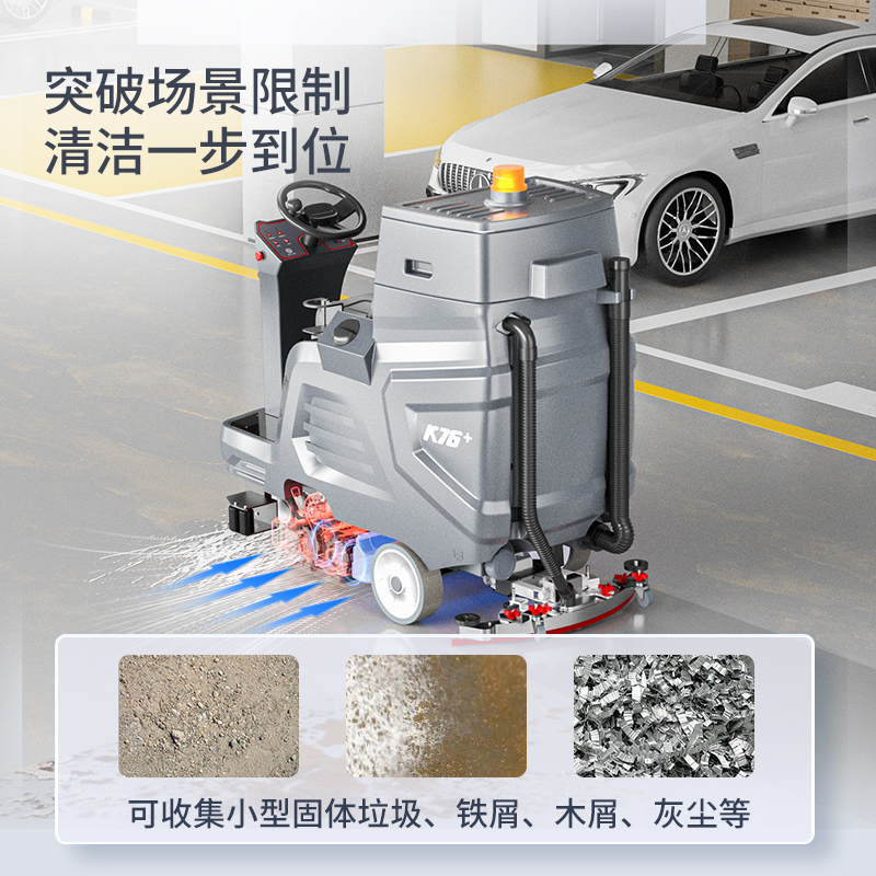 適用于車間、車庫(kù)、廣場(chǎng)等兼具粉塵與污漬的硬質(zhì)地面的同步清掃與清洗作業(yè)